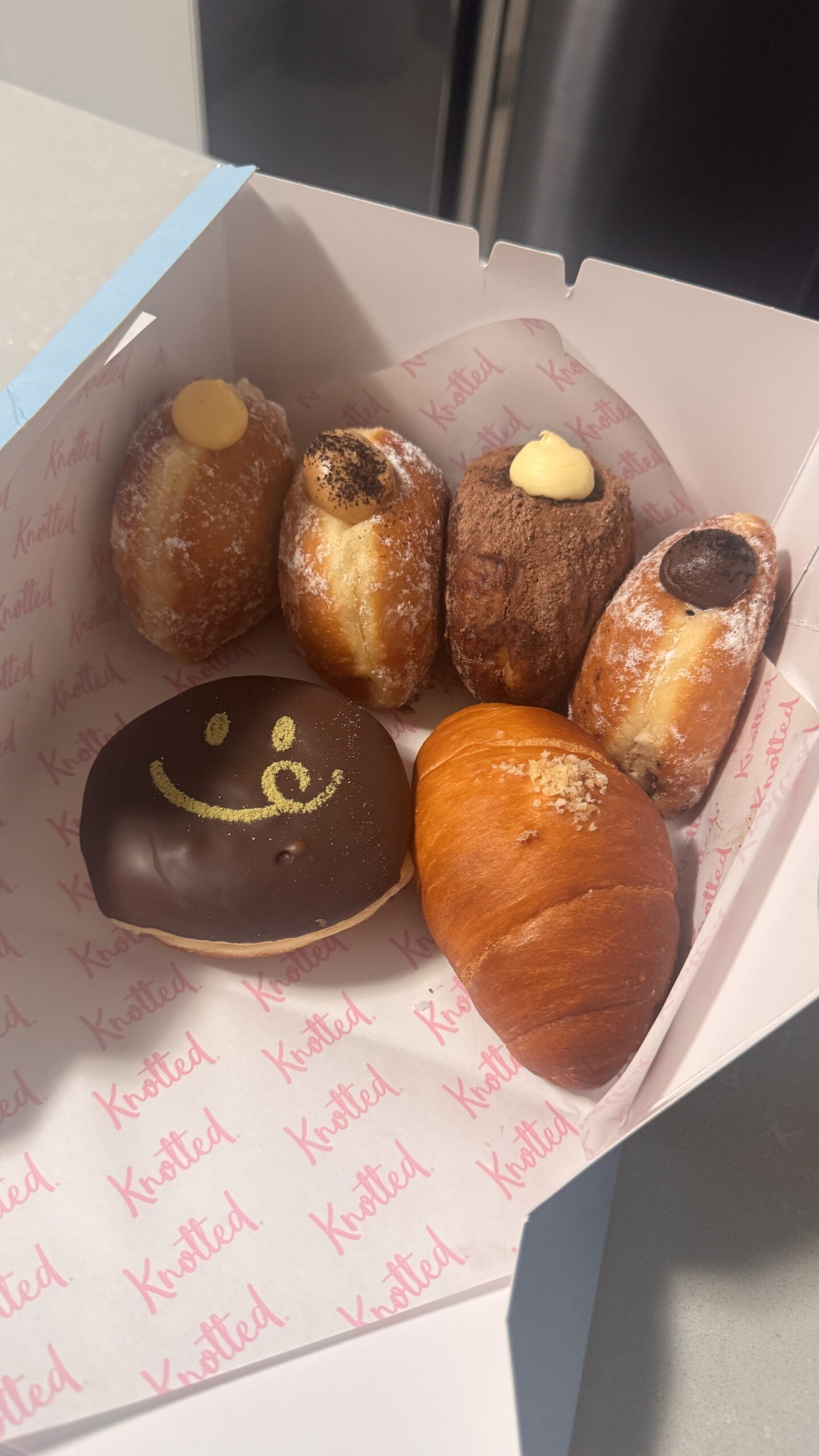Knotted Donut is famous for its soft texture and generous cream filling. The donuts are light, fluffy, and beautifully presented — which makes them perfect for photos and gifting.